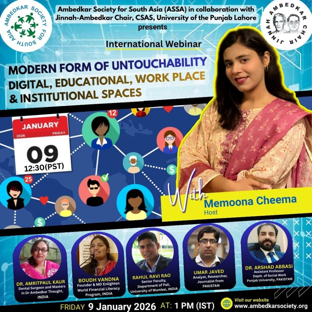 “Modern Form of Untouchability: Digital, Educational, Work Place & Institutional Spaces” on 9th January, 2025 at 1:30pm (Pakistan Standard Time), with Host Memoona Cheema.